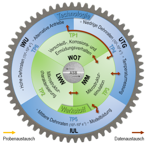 The figure shows the planned work packages. These are assigned to a modelling part and a validation and evaluation part. The modelling part contains three work packages, with each work package focusing on a specific modelling issue. These are then coupled unilaterally, i.e. results from WP1 are transferred to WP2 and WP3, while results from WP2 flow into WP3 if necessary. In the validation and evaluation part, micro tensile tests are carried out in WP5 to mechanically characterise the ASB or the material in the environment of the ASB. In WP4, a final validation and evaluation of the microstructure-based ASB modelling is carried out.