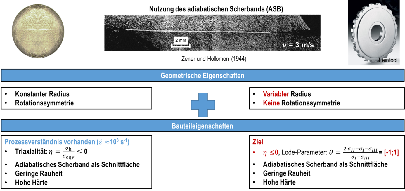 Shear band formation depends on the material properties, the stress state and the thermo-mechanical boundary conditions (strain rate, temperature). In HSB, the imposed thermo-mechanical boundary conditions are significantly determined by the process parameters (geometry of workpiece and tool, energy, punch speed) and the stress state. Previous investigations have essentially established correlations between cutting gap and cutting surface parameters for rotationally symmetrical components (lode parameters equal to zero). The focus of the TP is on influencing the stress state in the HSB to adjust the properties of non-rotationally symmetrical (non-zero Lode parameters) components (see Figure 1).